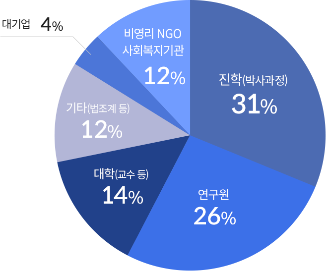 서울대학교 사회복지학과 대학원 졸업생들은 학계 뿐만 아니라 다양한 공공·민간·국제 분야에서 활약하며 우리 사회의 복지 증진을 위해 힘쓰고 있습니다.