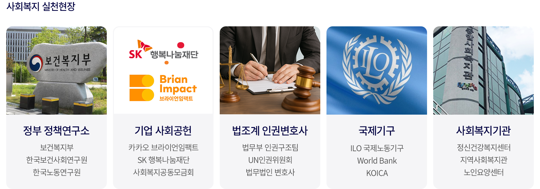 실제 이러한 이론적, 실천적 학습경험을 바탕으로 서울대 사회복지학과 졸업생들은 정부 정책연구소, 기업 사회공헌팀, 인권단체, 국제기구 등에서 사회문제 해결 전문가로 활약하고 있습니다.