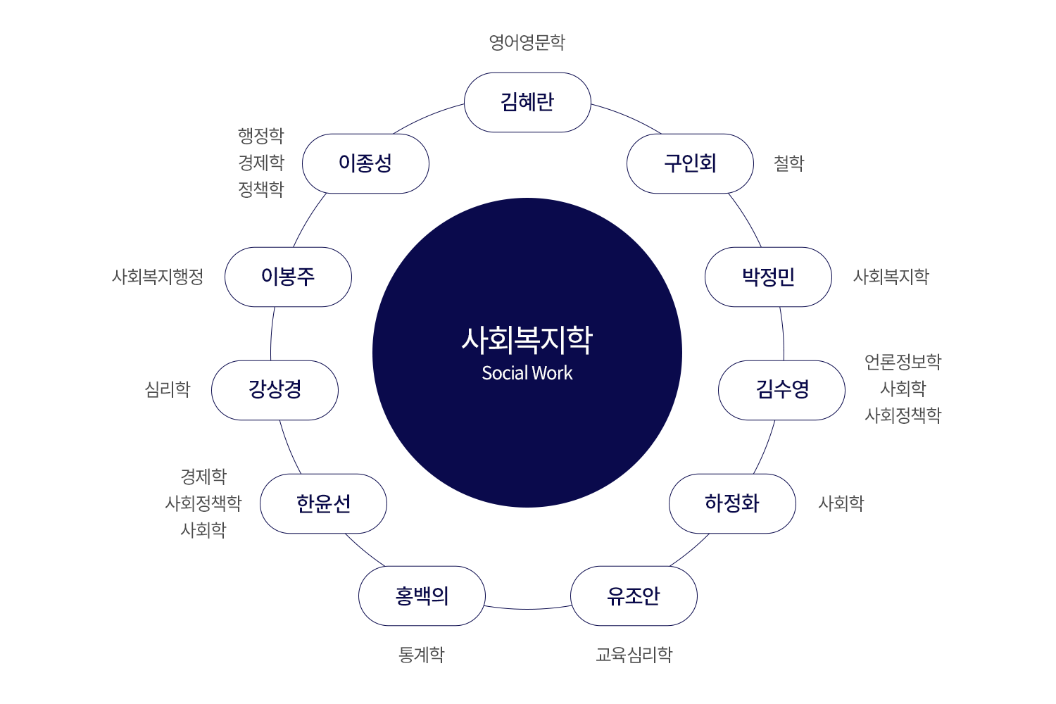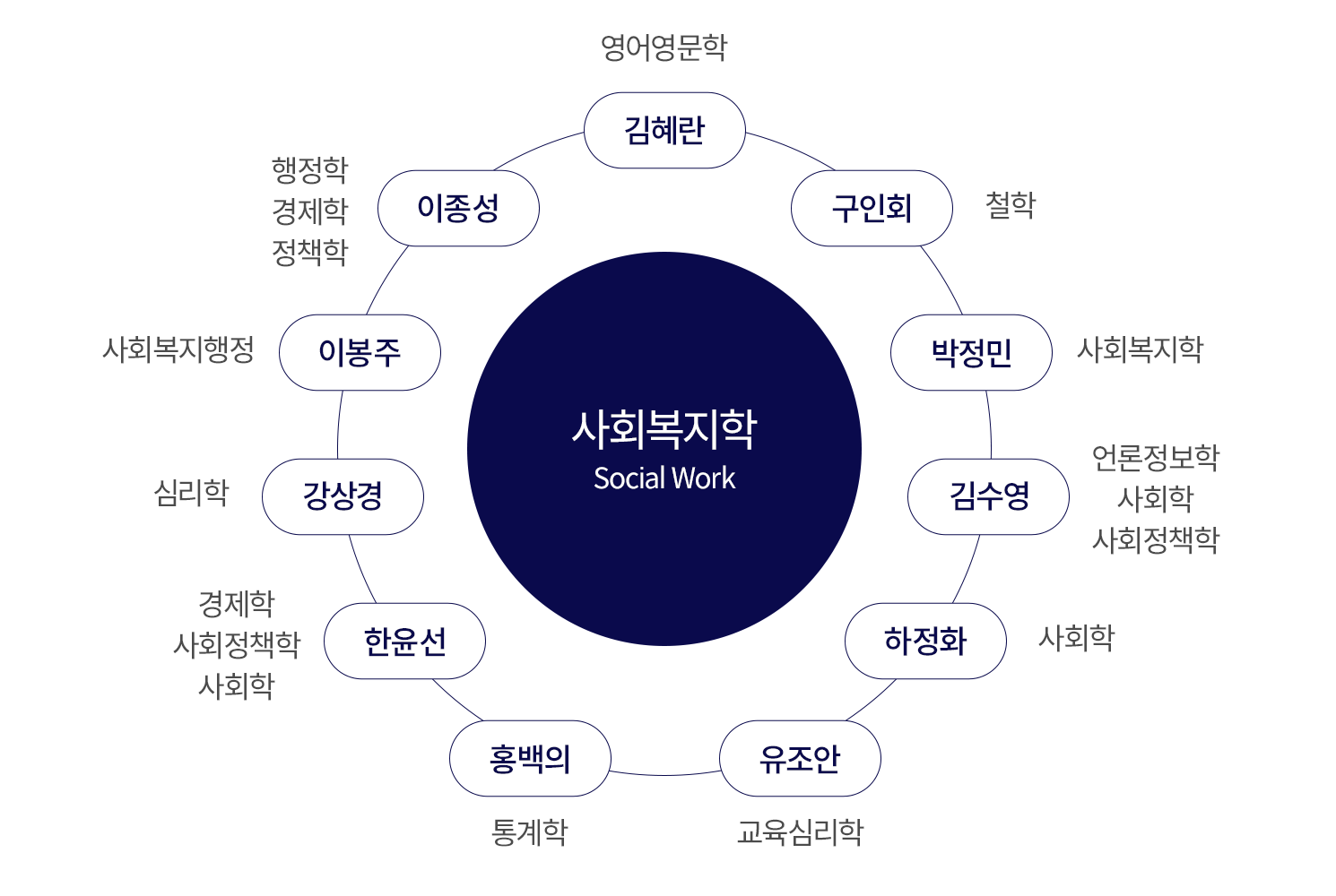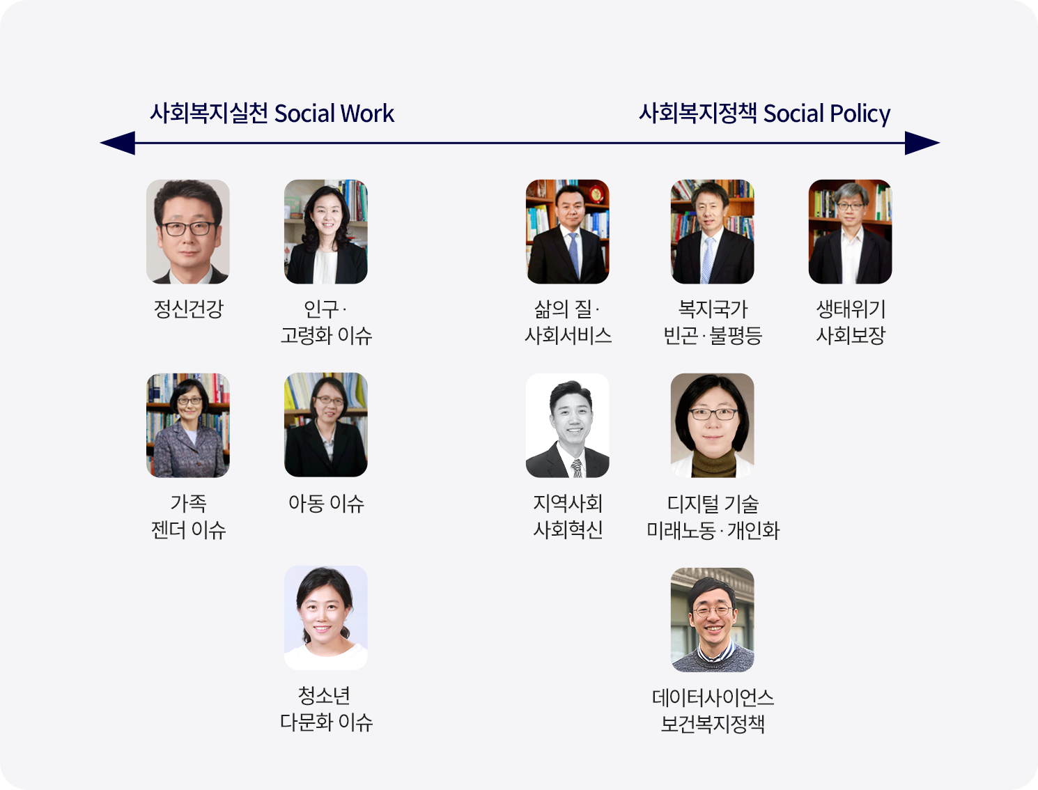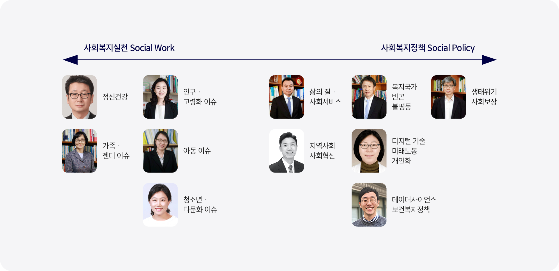 이처럼 교수진은 미시적 실천 영역(social work)부터 거시적 정책 영역(social policy)까지를 아우르며,