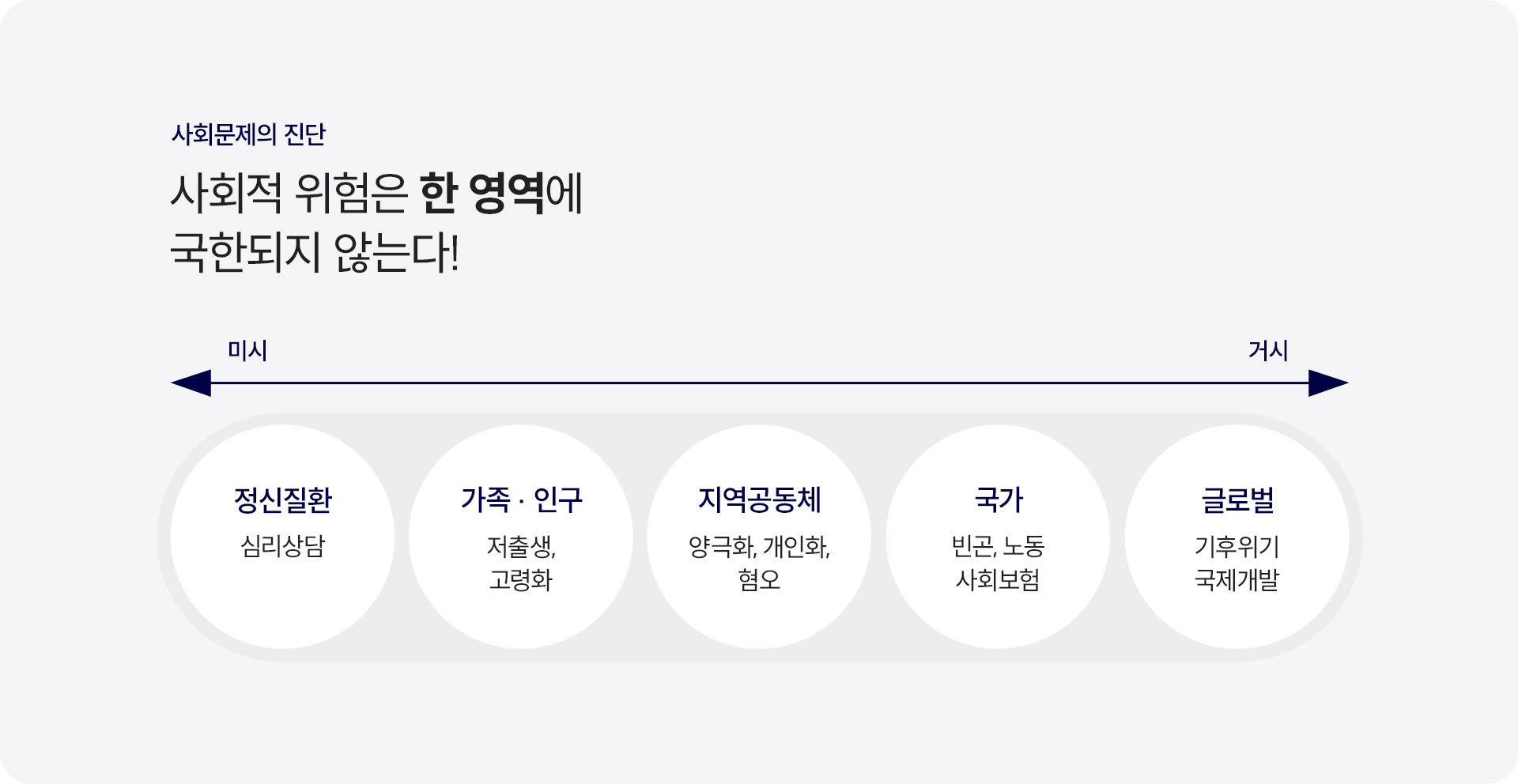 거시적 수준에서는 사회공동체 회복과 사회혁신, 사회보장정책의 설계와 평가, 초국가적 생태위기에 이르기까지 폭 넓은 주제를 다룹니다.