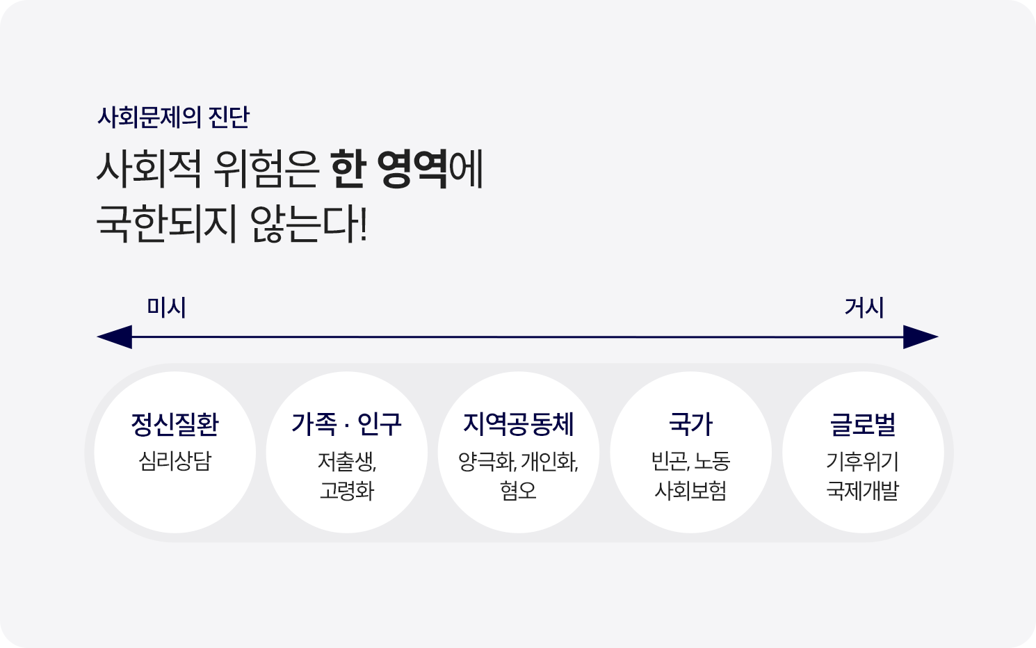 거시적 수준에서는 사회공동체 회복과 사회혁신, 사회보장정책의 설계와 평가, 초국가적 생태위기에 이르기까지